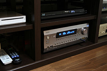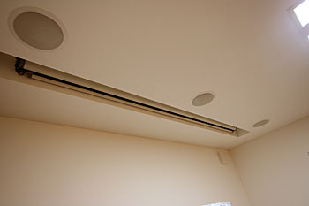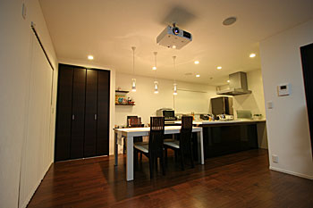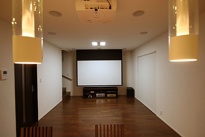 新築1Fのリビングダイニングに100インチスクリーン、7.1chスピーカーシステムなどをインストール。