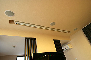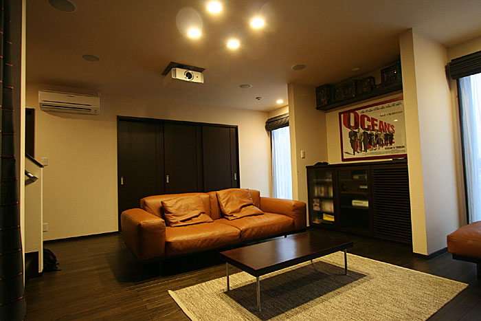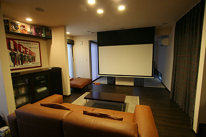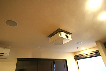 プロジェクターには天吊り、埋込みデザイン。機材はリビング横のラックに納められています。
