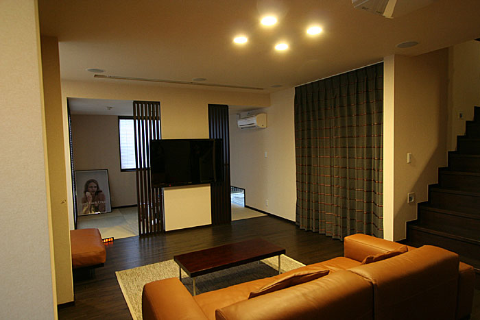 TVはリビング奥になる和室スペースとのパーティション壁面に壁掛。格子のアレンジでデザインされています。