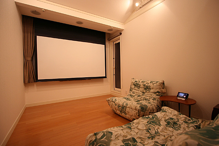 2Fのプレイルームにホームシアターをインストール。スクリーン、プロジェクター、7.1chスピーカー、システムコントローラーなどを設置。DVD、Blu-ray、地デジ、ゲームなど多目的に楽しんで頂けるスペースです。