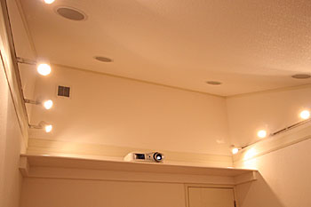 同じくリアスピーカーも天井に埋込みタイプ、プロジェクターは棚に設置しています。