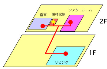 2Fのプレイルームにホームシアターをインストール。その他1Fにも繋がるマルチルーム設計です。