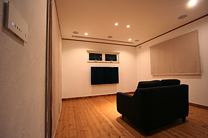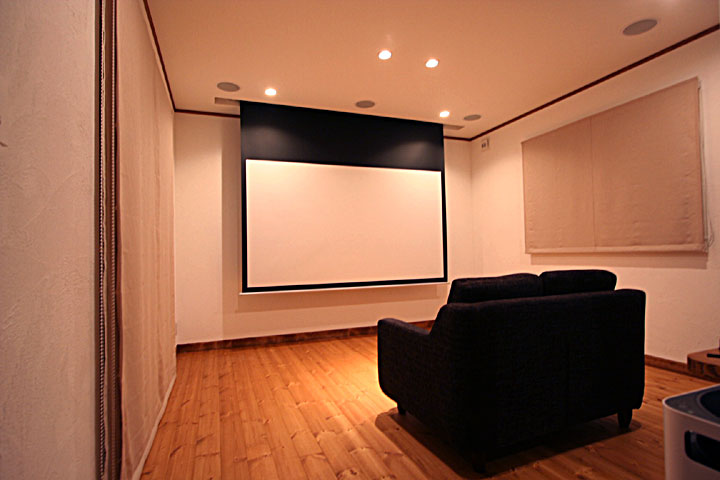 スクリーンは天井に埋込みボックス、スピーカーも全て天井に埋込んでいます。
