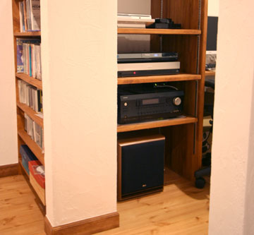 各機材、サブーハーは書斎側に専用スペースを設けています。 そのほか照明コントロール、キッチンスピーカー、iPadシステムなどを取入れたホームシアターシステムとなっています。