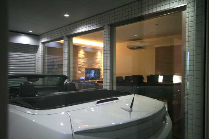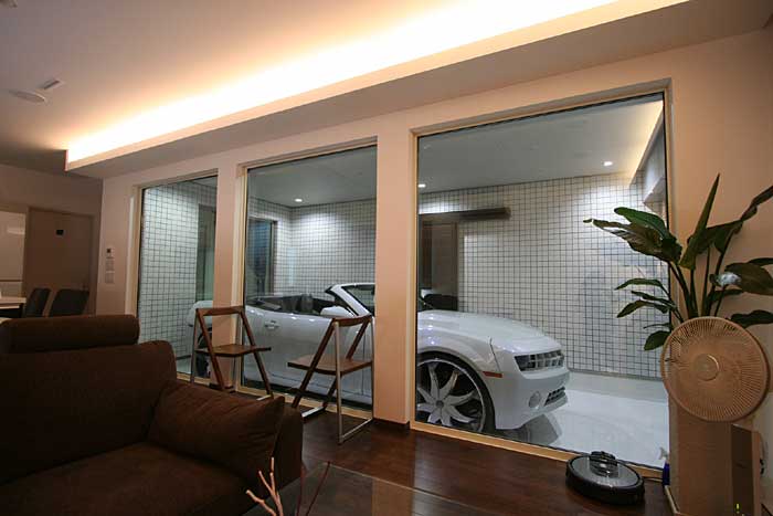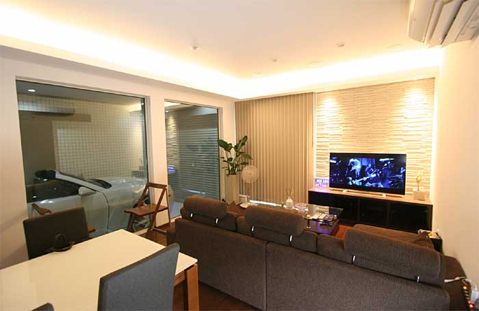 インナーガレージが目を引くリビングルへ埋込みスピーカー等TVシアターをインストール。