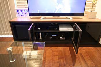 機材は専用サイズで作られたラックへ、スブウーハーもぴったり収まっています。
