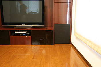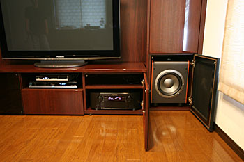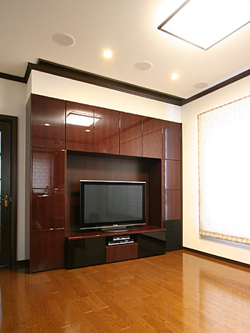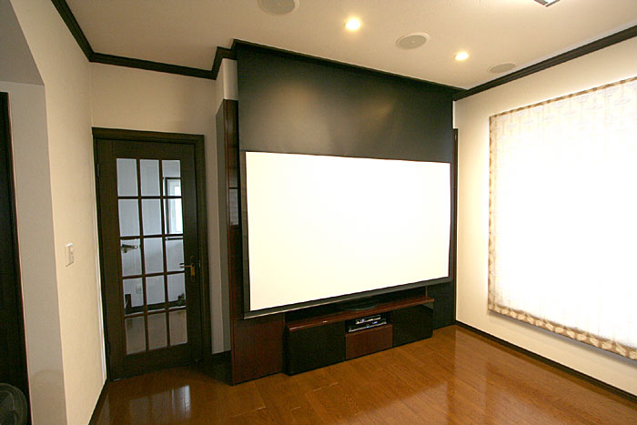 新築1Fのリビングルームに100インチスクリーン、プラズマTV、5.1chスピーカーシステム。