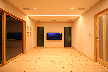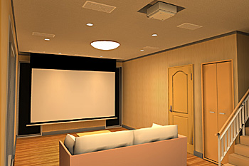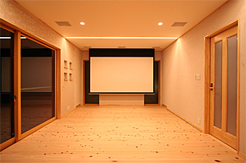 新築1Fリビングルームに120インチスクリーン、プラズマTVを利用した7.1chシアターをインストール。