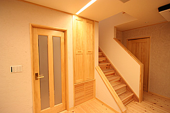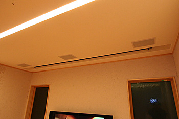 スピーカーは天井に埋込み、サブウーハー、機材などは全て収納庫をもうけています。