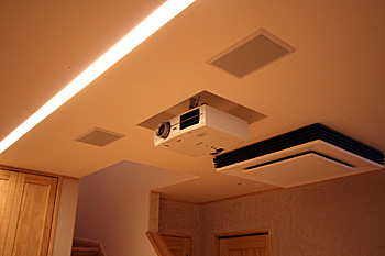 プロジェクター取り付け面は天井を造作、サラウンドスピーカーもうめ込みインストール。