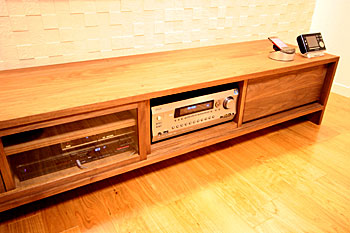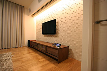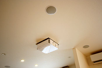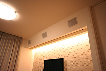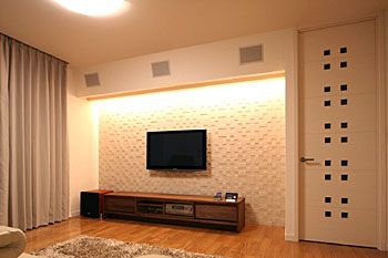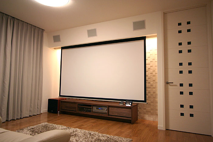 新築1Fのリビング壁掛120インチスクリーン、TV、7.1chスピーカーシステムなどをインストール。 ホームシアターファイル62号掲載