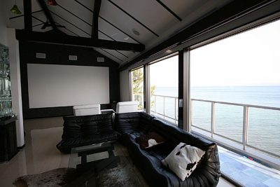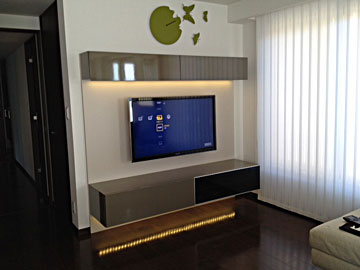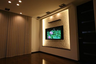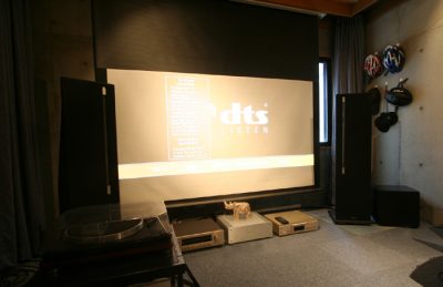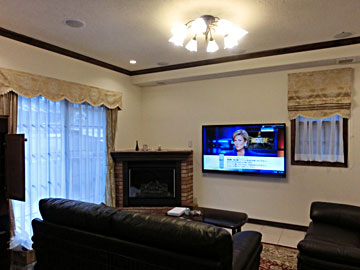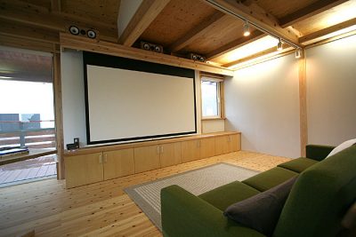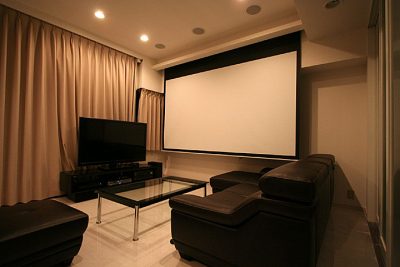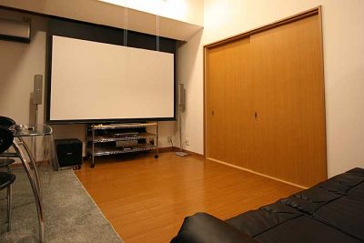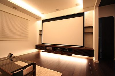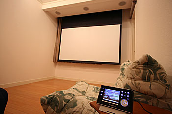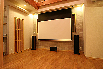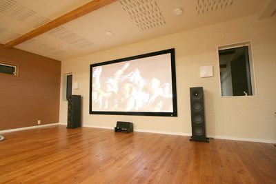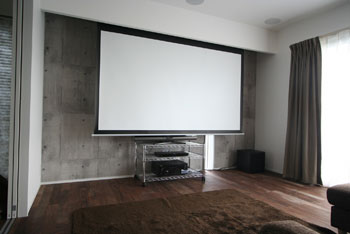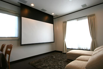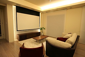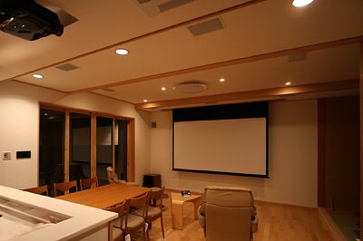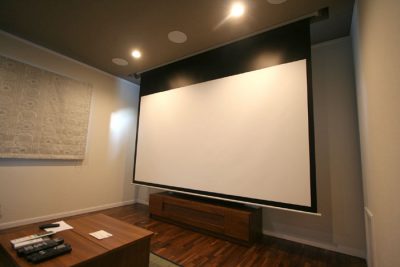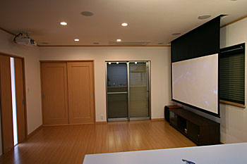 新築1Fのリビングルームに120インチスクリーン、7.1chスピーカーシステム、3DTVなどをインストール。