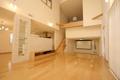 新築1階、吹き抜けのあるリビングルームに設置。「プロジェクター、7.1chスピーカー、AVアンプ、ユニバーサルプレーヤ、プロジェクションTV等のインストール」