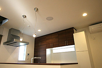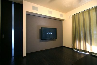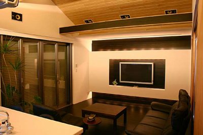 新築1Fリビングルームに、プロジェクター、スクリーン、7.1chスピーカーシステム、プラズマテレビ。2Fにはプラズマテレビ、埋込みスピーカーをインストール。