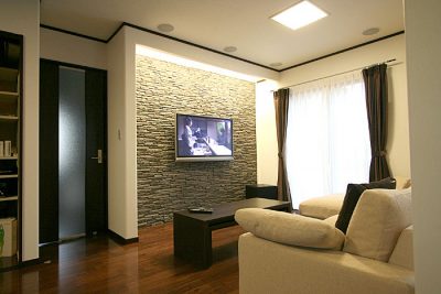 新築3階の落ち着いた雰囲気のリビングルームにシアタールームを設置。すべてを隠すインウォール型