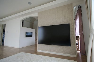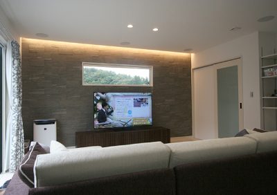 新築1Fリビングルームに壁掛TV、スクリーン、7.1chスピーカーシステム、キッチンスピーカー、iPadコントロールシステム等ホームシアターをインストール
