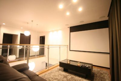 新築1Fにリビングルームに120インチスクリーン、7.1chスピーカー、3Dプロジェクター、iPadコントロールシステム等をインストール。